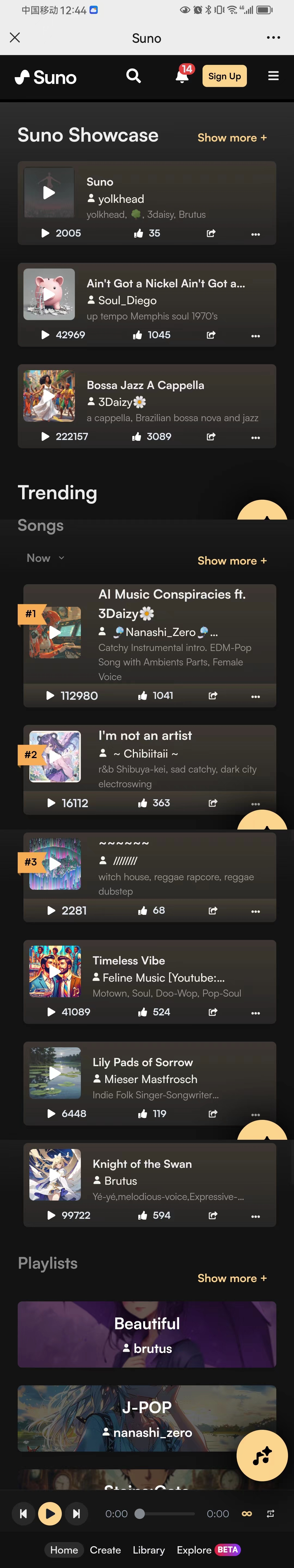 Suno正在建设一个任何人都可以做出伟大音乐的未来。无论您是淋浴歌手还是排行榜歌手,我们都会打破您和您梦想制作的歌曲之间的障碍。不需要仪器,只需要想象。从你的思想到音乐。
